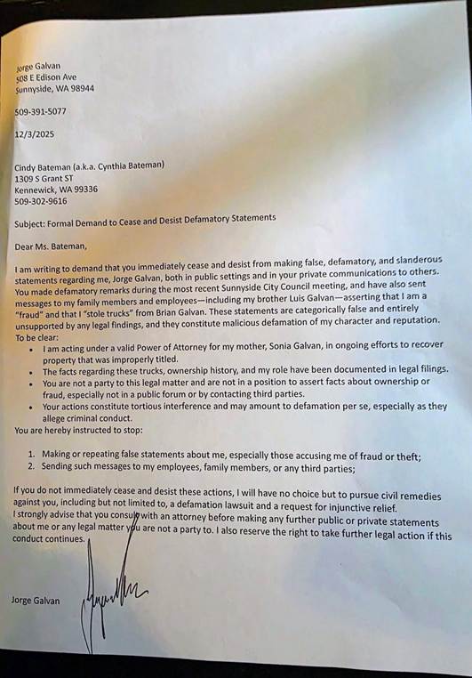 On December 1st, Deputy Mayor Galvan’s father, Brian Galvan attempted to speak during public comment at a Sunnyside City Council meeting. He was informed—correctly—that his remarks needed to be limited to the scope of a public hearing item. He was told by Mayor Dean Broersma he would need to come back on December 8th to address the City Council. In between that time, Brian Galvan was sent a letter by his son attempting to stop him from speaking out against him publicly.