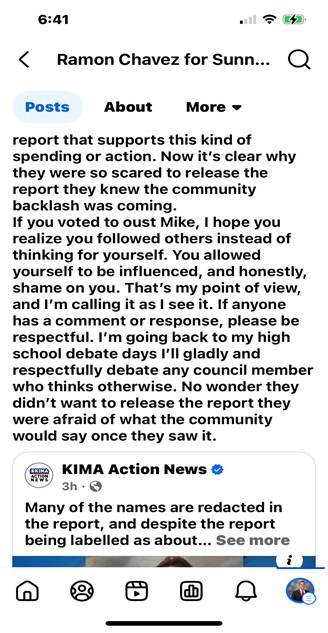 Ramon Chavez, candidate for Sunnyside City Council District 4, publicly condemned the report in a viral Facebook post Wednesday night. His message, posted on his campaign page, accused the City Council of wasting taxpayer dollars and allowing politics to override truth.