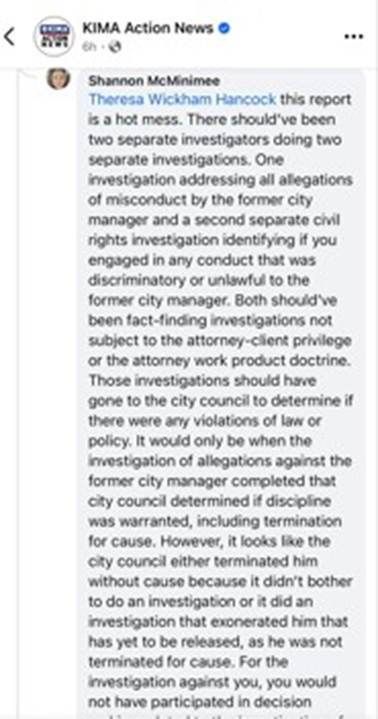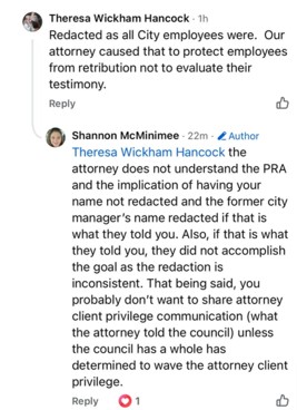 Attorney Shannon McMinimee, who was on the Facebook thread, called the investigation “a hot mess,” saying it violated standard conflict-of-interest protocol. “There should have been two separate investigations,” she wrote. “One into the City Manager and another into the councilmember. The City either terminated Gonzalez without cause, or it completed an investigation that exonerated him and has yet to release it.” McMinimee also called out Hancock’s potential violation of sharing attorney-client privilege in an open forum.