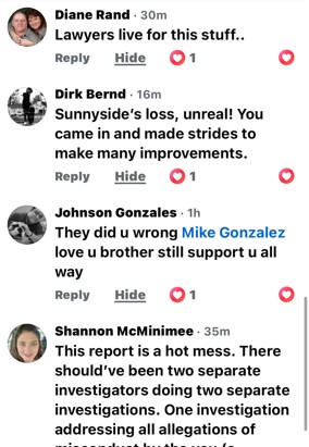 “Sunnyside needs to get rid of Ms. Hancock,” one commenter wrote. “It was a sham investigation — $12,000 paid to the investigator, two City Managers paid over $100,000,” said another. “Basically, they found nothing,” another added.