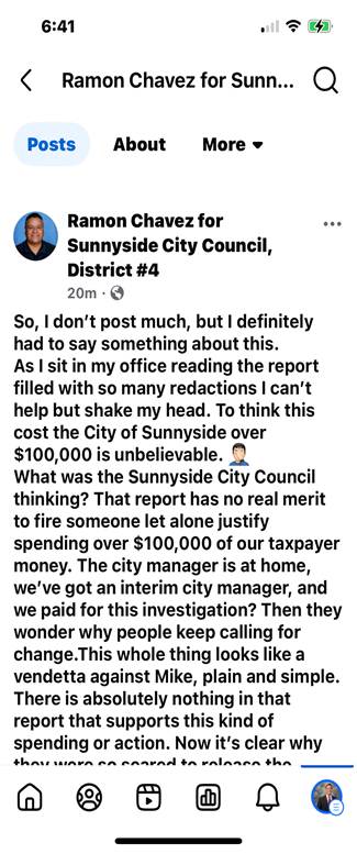 “So, I don’t post much, but I definitely had to say something about this,” Chavez wrote. “As I sit in my office reading the report filled with so many redactions, I can’t help but shake my head. To think this cost the City of Sunnyside over $100,000 is unbelievable.”