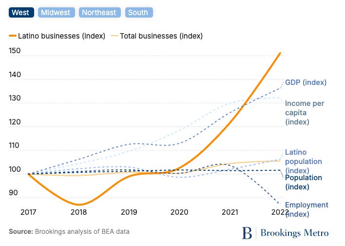 And yet the pattern was national. Growth was observed across the Midwest and parts of the Southern Appalachians. Latino or Hispanic-owned businesses also contributed heavily to overall business growth in major metro areas. According to Brookings, they accounted for over 93% of total growth in Miami, 47% in Los Angeles, and 65% in Orlando.